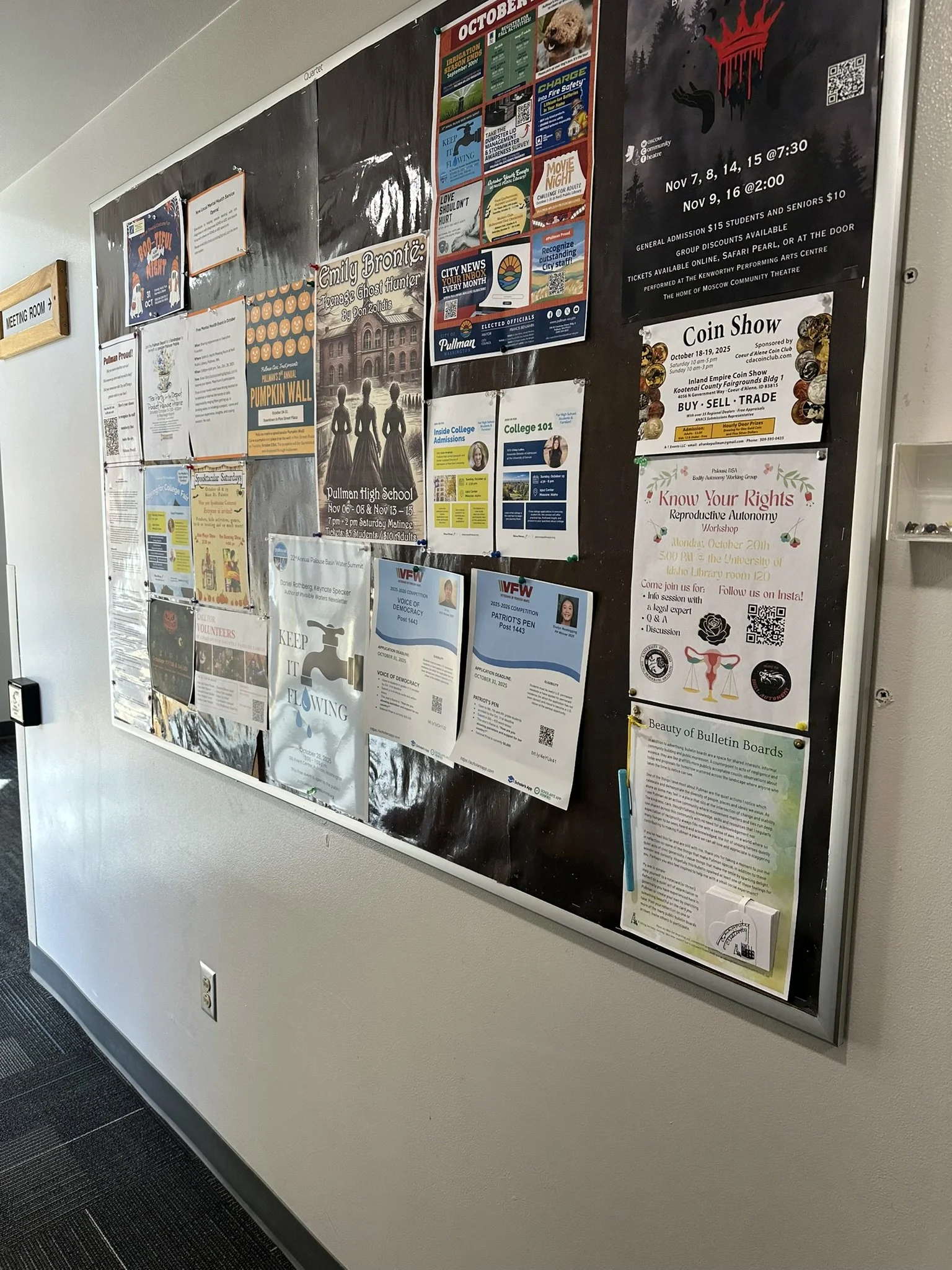 Bulletin board at the entrance of Neill Public Library in downtown Pullman
